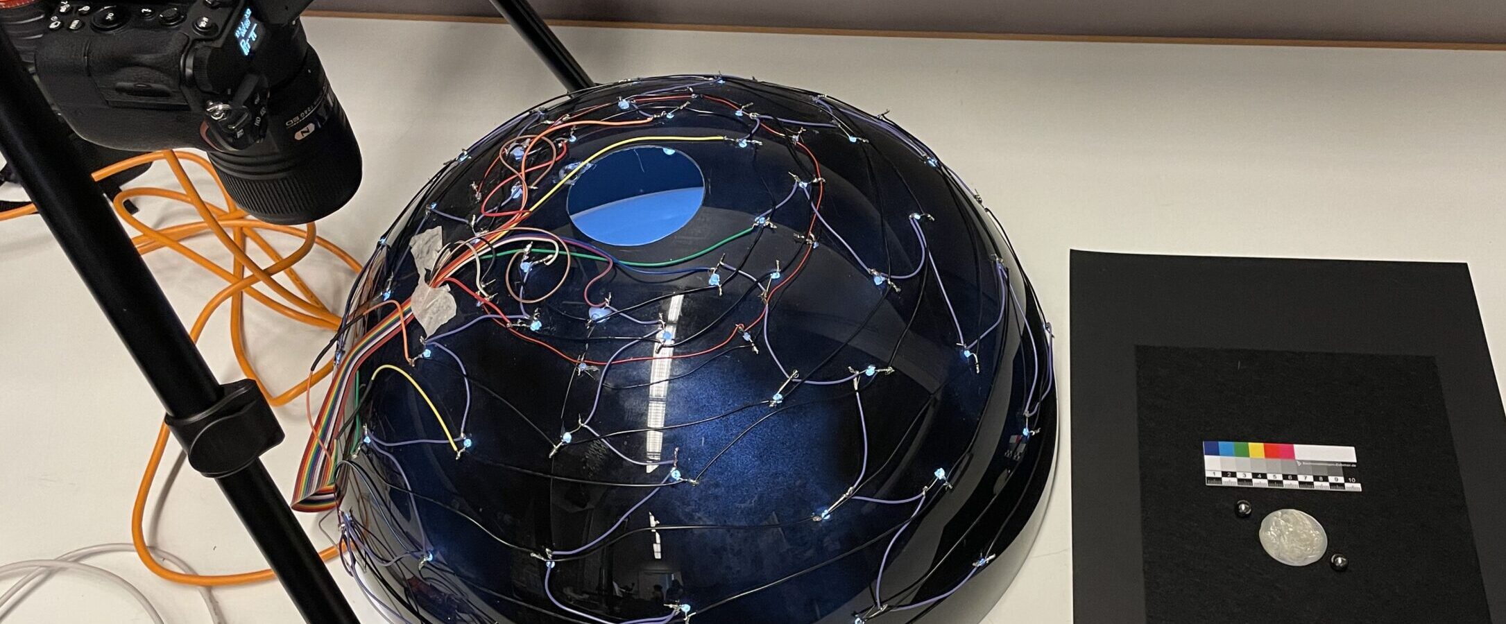 Traditional imaging techniques struggle to represent this interplay of light and material. Photographs flatten the lustrous surface; 3D scans cannot reproduce its shifting glow. RTI offers a powerful alternative, allowing the digital relighting of an object’s surface so that its visual character can be experienced dynamically. Through this technique, Shimmering Faith further explores how light-dependent materials can be rendered visible, interpretable, and accessible in digital form.
